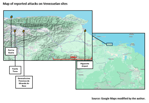 At this stage, few details are available but it seems likely the strikes against Higuerote and Generalissimo Francisco de Miranda were designed to knock out Venezuelan air defences. Venezuela has a strong air defence net work that includes modern Russian weapons like S-300VN long-range missiles, Buk-M2 medium-range missiles and Pantsir-S1 combined gun and medium-range missile systems. [iv] Air fields provide large, secure, open spaces that make them good places to deploy air defence. The attacks on the La Guaira may be similar because the Venuzaelan Navy has a small frigate with air defence missiles, or there may be land-based air defence missiles stationed there. The attack on Fuerte Tiuna army base was probably to stop soldiers there from intervening in the operation.